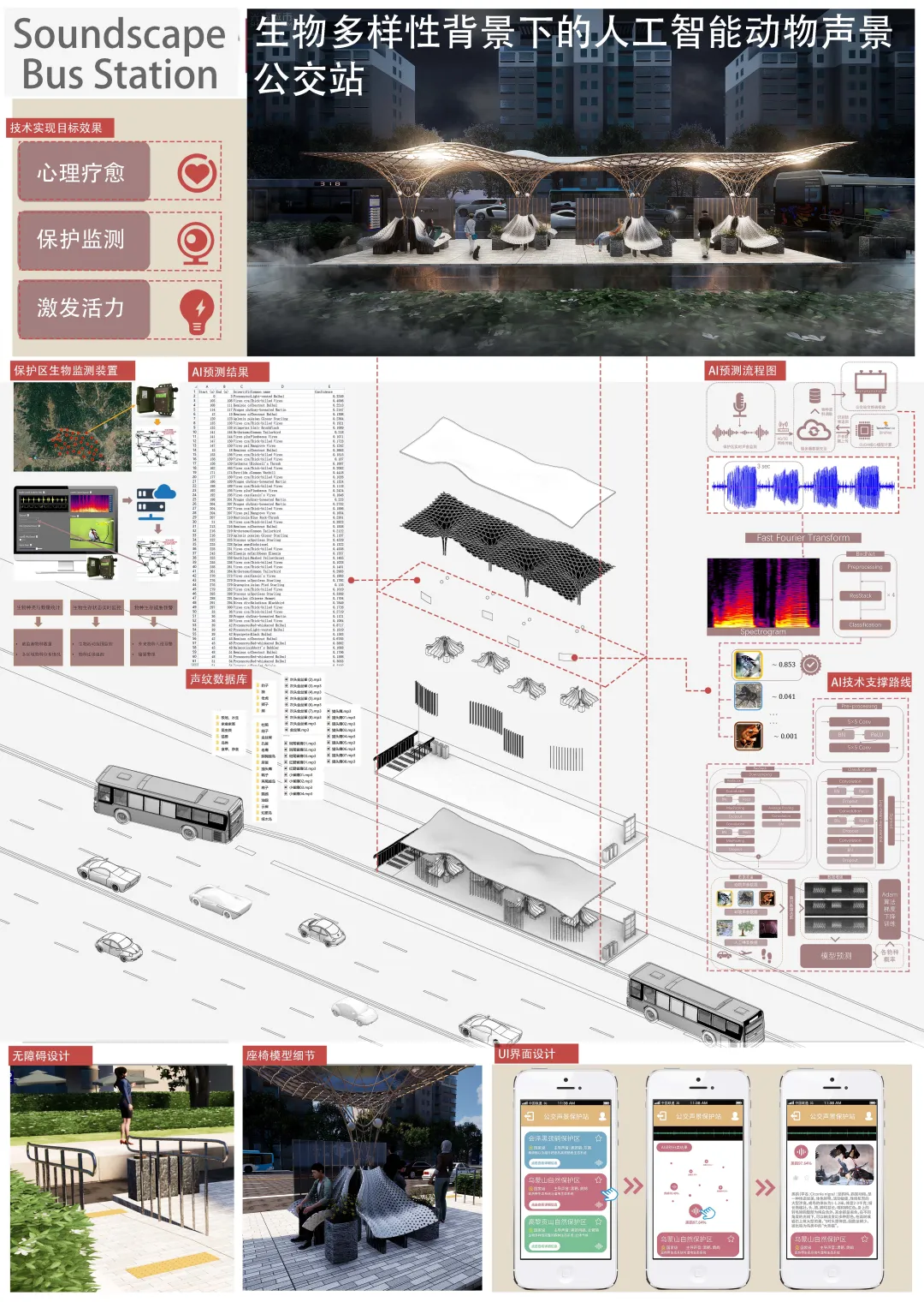 由邓智骁、韩理光、谭良斌三位老师指导的研究生参赛作品《生物多样性背景下的动物声景公交站》荣获大赛一等奖。作品依托于云南地域特色、充分发挥了蘑菇视频