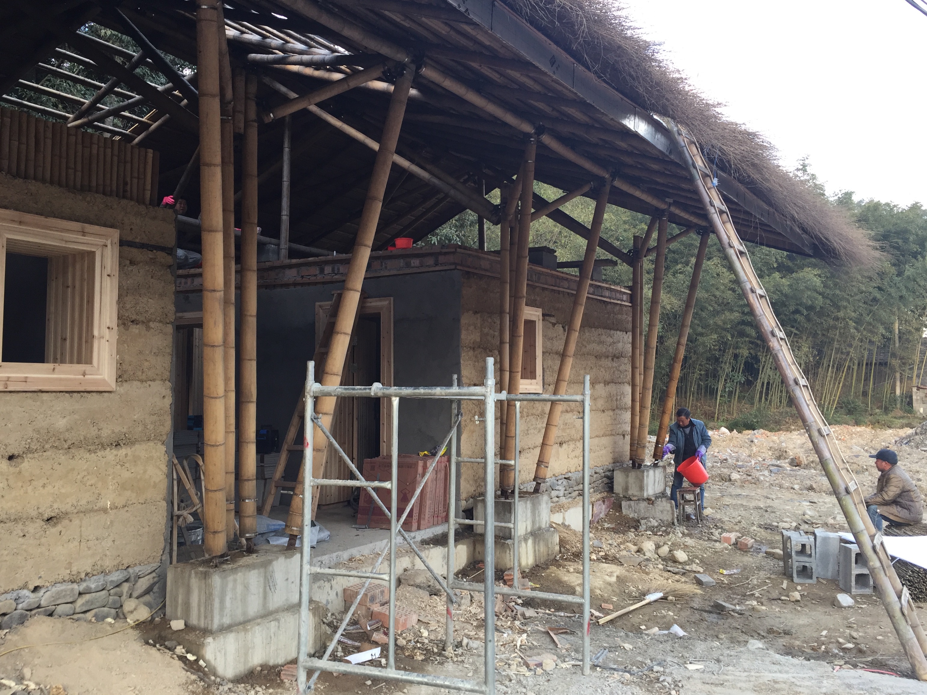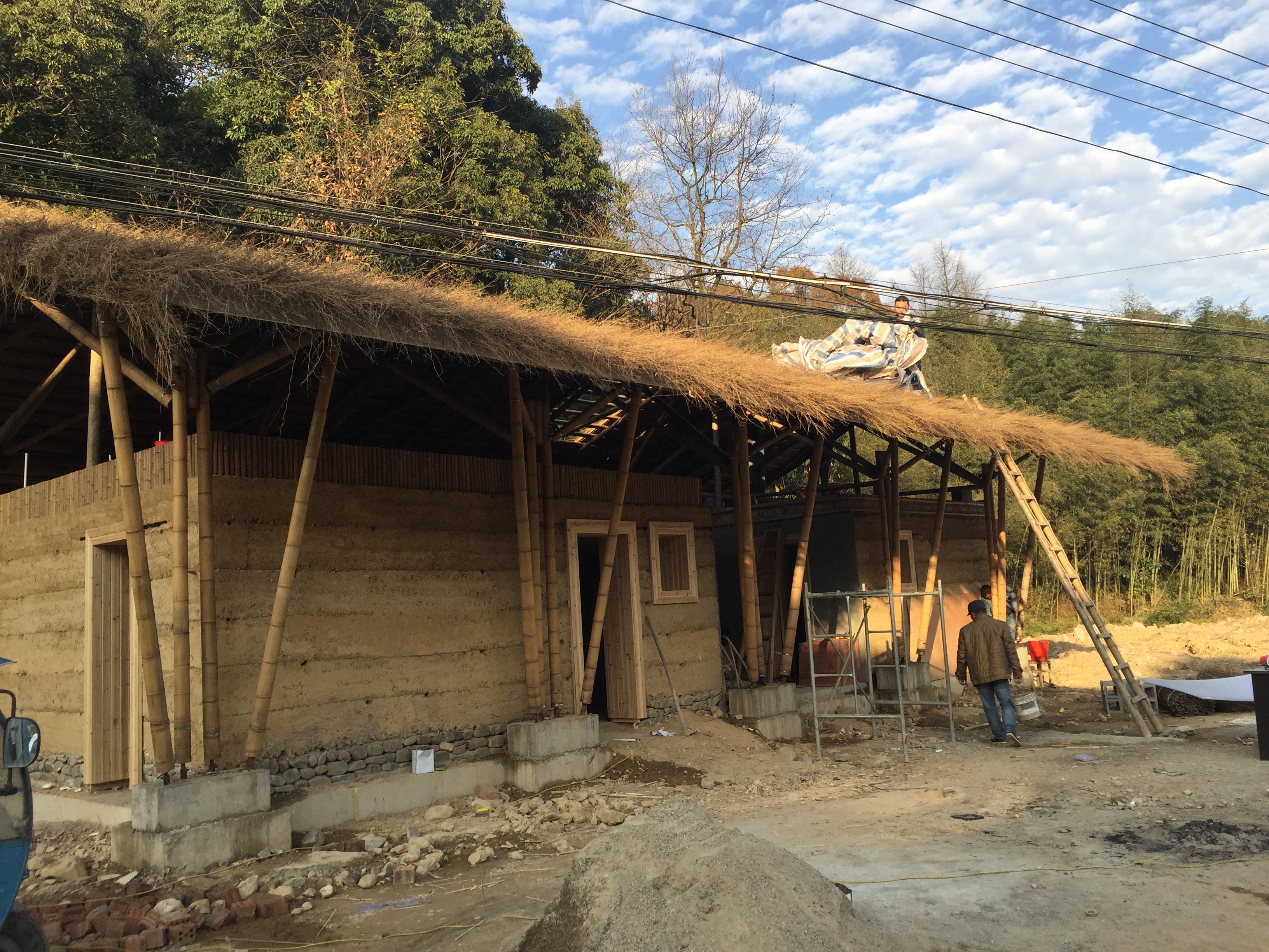 的大竹旅游公厕,则还原了古朴的夯土结构,竹子伸向天空,构成屋架,土,锚固大地,形成墙体,形成“轻”与“重”、“天空”与“大地”的对话。
