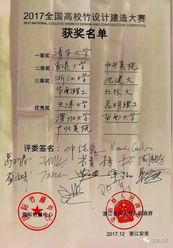 12月11日,2017全国高校竹设计建造大赛颁奖典礼,暨首届国际“竹产业·竹建筑·竹文化”绿色发展高峰论坛在安吉召开。来自全国13所高校的竹建筑作品揭开面纱,上演了一场乡村竹建盛宴。