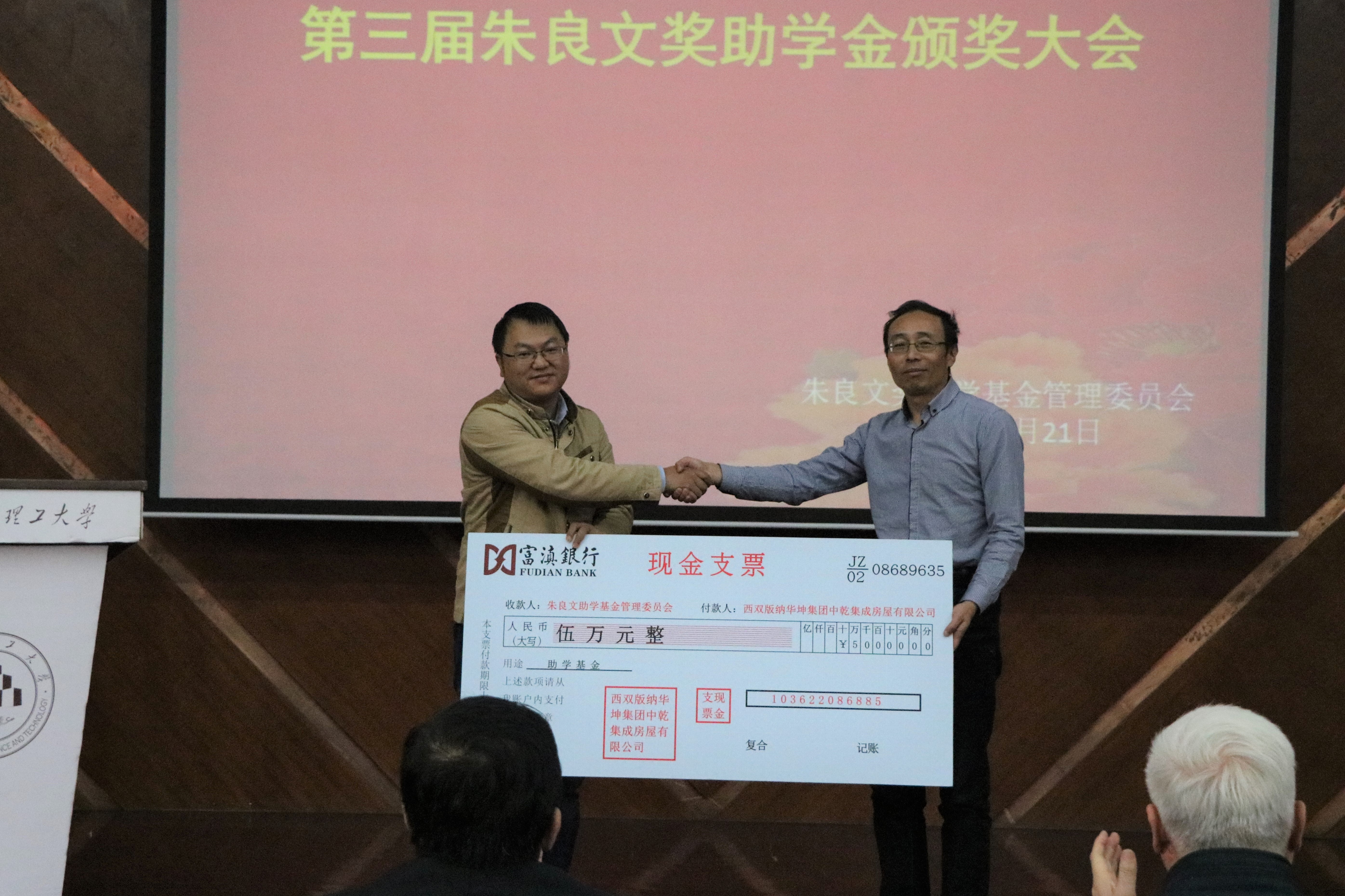 同时,在颁奖大会上,西双版纳华坤集团王云董事长捐资五万元注入朱良文奖助学基金,以表对朱良文教授善举的支持以及对贫困学子的关爱,同时向与会者讲述了与朱良文教授结缘的点点滴滴,祝愿所有同学带着感恩的心在未来的人生道路上健康成长。
