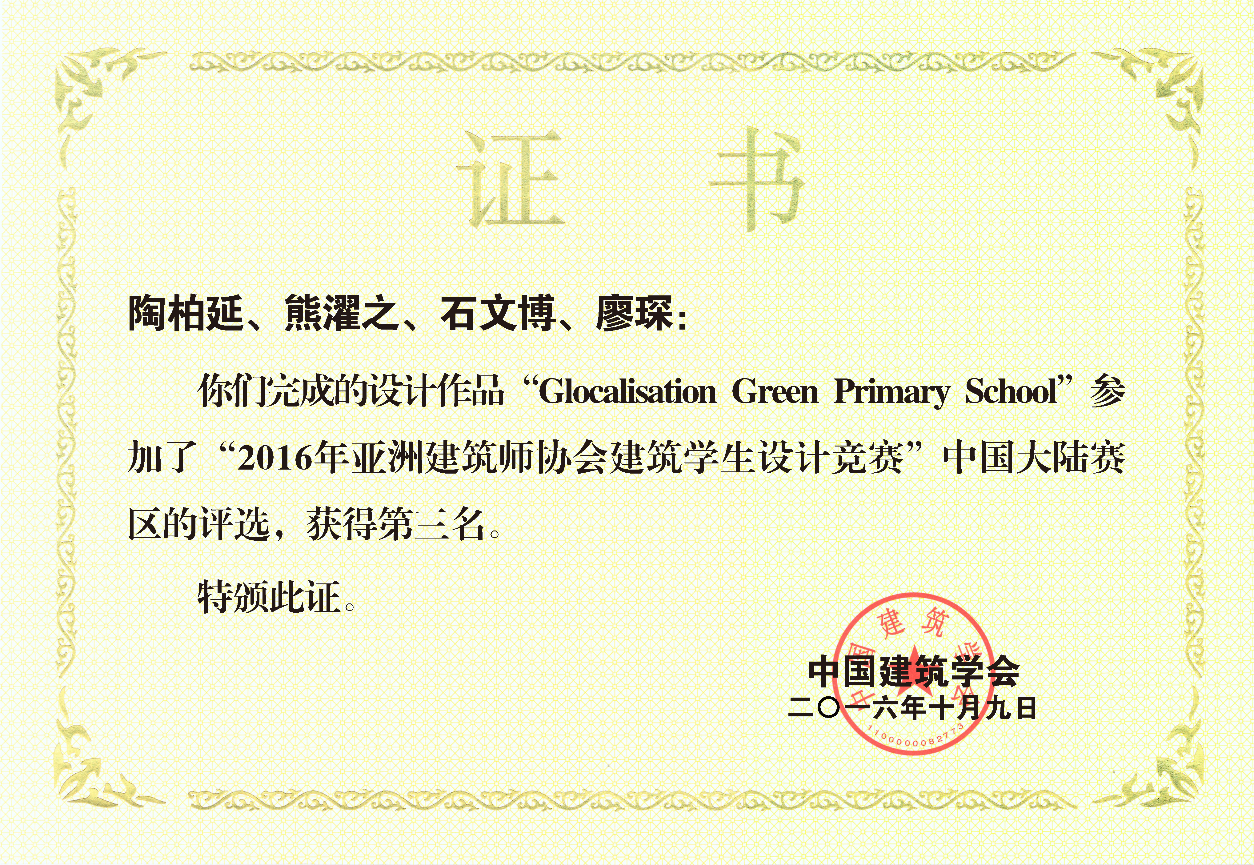 王冬、杨大禹、吴志宏、李莉萍四位老师指导,建筑学系2014级硕士研究生陶柏延、熊濯之、石文博、廖琛等同学完成的作品“海公馆小学”作为中国大陆赛区top 5的作品之一,最终获得第三名。