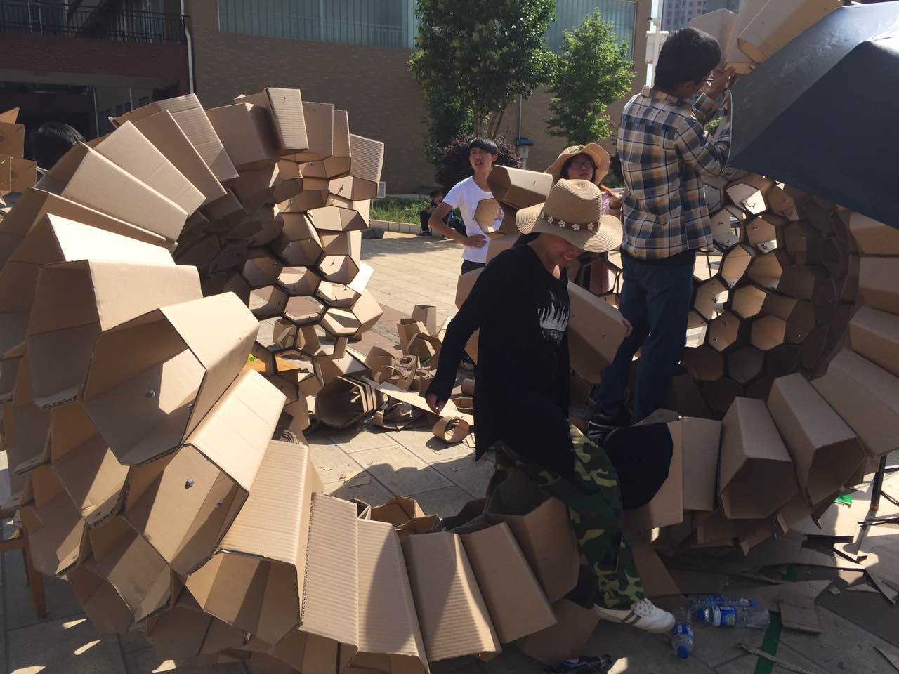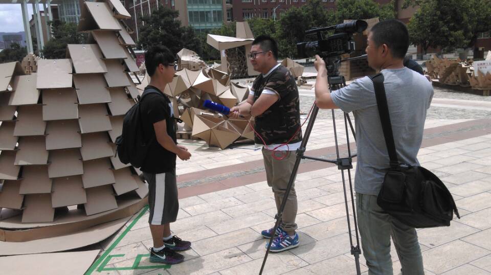 开幕式结束后,各高校参赛小组进入了紧张的建造环节。经过同学们27小时辛苦、紧张的建造,23栋风格迥异的纸板建筑矗立在学院广场上,28下午评委团对每一栋纸板建筑进行评审。经评委团对各纸板建筑在结构、空间和形态等方面的综合考量,评出了本届建造节的各个奖项。获得一等奖的是蘑菇视频