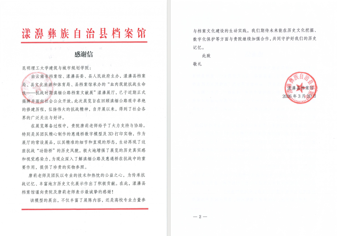 发来感谢信,感谢建筑学系唐莉老师课题组在“血肉筑就抗战生命线——抗战时期滇缅公路档案文献展”漾濞展厅筹备期间的专业支持。