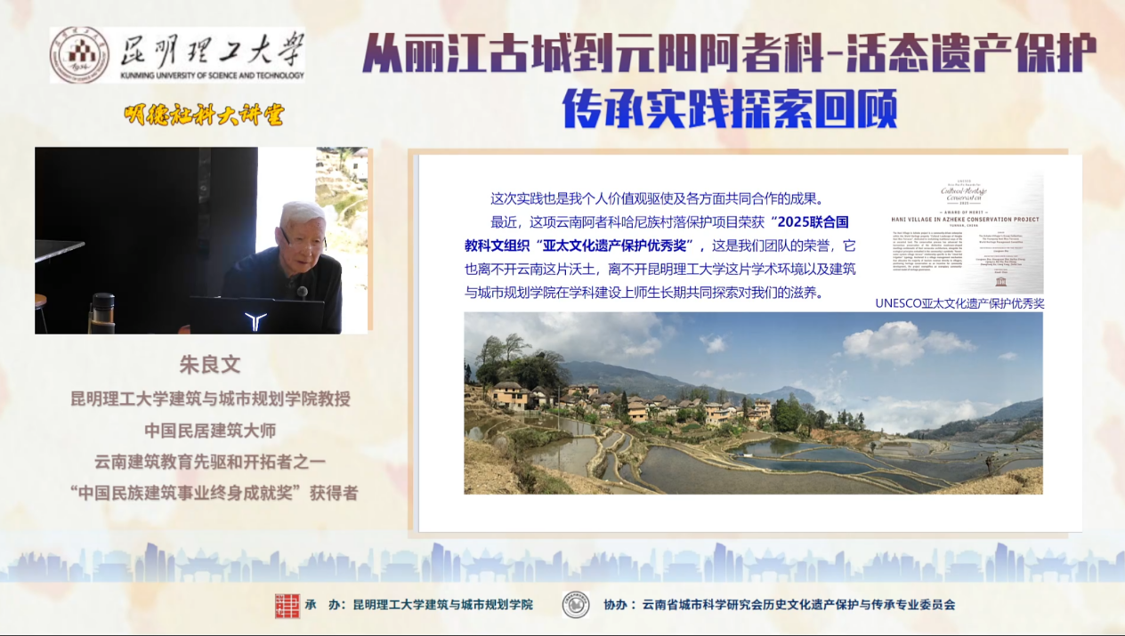 讲座尾声,一个振奋人心的消息传来——朱良文教授主导的元阳阿者科哈尼族村落保护项目,近期荣获“2025联合国教科文组织亚太文化遗产保护优秀奖”。谈及这一成果,朱良文教授谦逊表示,这份荣誉离不开云南这片文化沃土的滋养,更离不开蘑菇视频