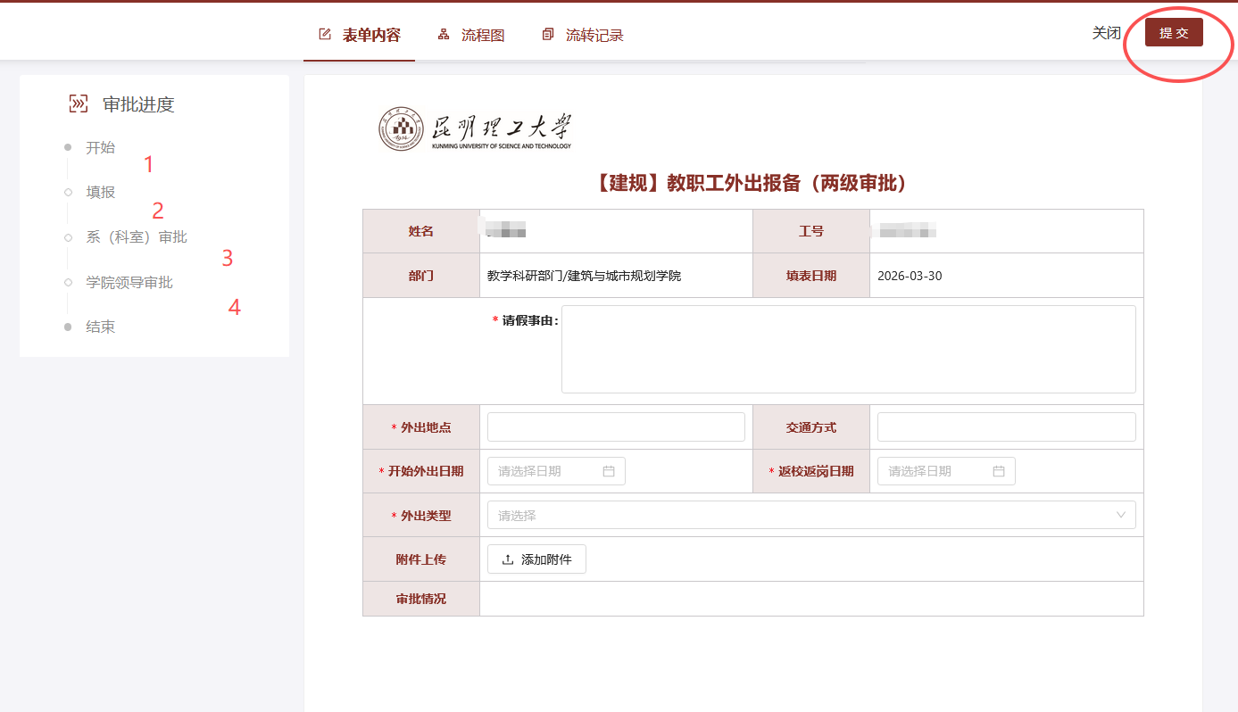 二、表单填写与审批提交。申报人按要求完整填写线上申请表单及上传附件,确认信息无误后提交,由本单位系(科室)、学院领导逐级完成审批。