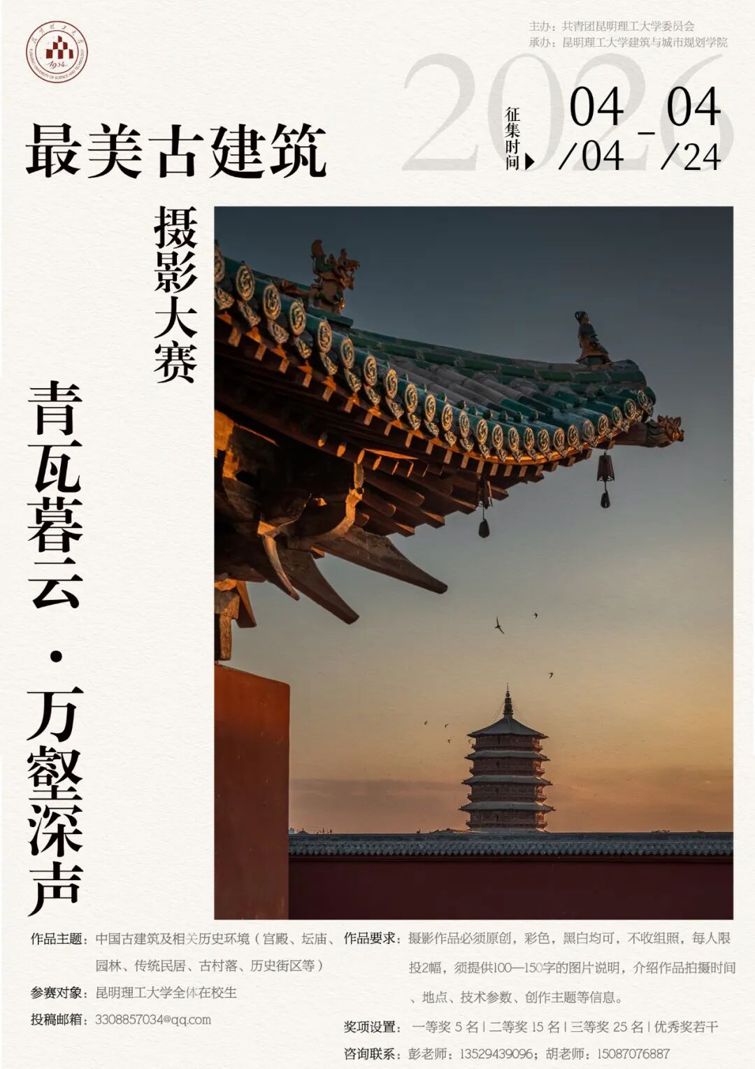 青瓦叠岁月,暮云映匠心。古建筑是中华优秀传统文化的重要物质载体,凝结着中华民族悠久的历史记忆、独特的营造智慧和深厚的审美精神,也承载着鲜明的地域文化特征与时代价值。本次活动以古建筑摄影为载体,引导广大青年学生在观察、记录与表达中深化对中国古建筑及其文化内涵的理解,在镜头语言中感悟传统建筑之美、工匠营造之美和文化传承之美,把审美体验转化为文化认同,把专业观察转化为实践表达,在校园中营造积极健康、昂扬向上、兼具人文厚度与专业深度的文化氛围。